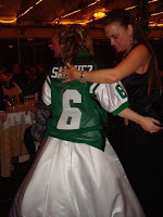 My brother in law got married on Saturday and we were all in the wedding. It just so happened that service was at 5 pm which was during the Jets - Bengals playoff game. Kim the beautiful bride is a huge Jets fan so as a show of solidarity for her team she came down for the cocktail hour (before the reception) wearing her Jets jersey of Mark Sanchez. I just had to get my picture taken with her and post these here: